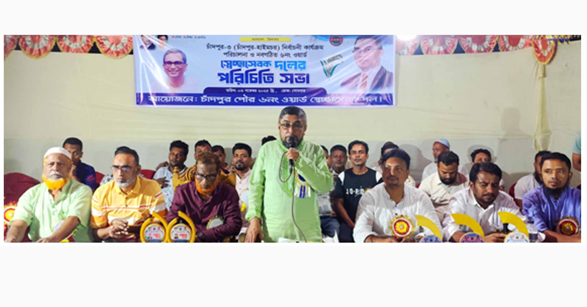স্টাফ রিপোর্টার ঃ চাঁদপুর-৩ আসনে নির্বাচনী প্রচারণা কার্যক্রম এবং নবগঠিত পৌর ৬নং ওয়ার্ড স্বেচ্ছাসেবক দলের পরিচিতি সভা অনুষ্ঠিত হয়েছে। ৩ নভেম্বর সোমবার রাতে চাঁদপুর শহরের কয়লা ঘাট এলাকায় এই সভা অনুষ্ঠিত হয়। সভায় প্রধান অতিথির বক্তব্য রাখেন চাঁদপুর পৌর বিএনপির সভাপতি আক্তার হোসেন মাঝি। বিশেষ অতিথির বক্তব্য রাখেন পৌর বিএনপির সাধারণ সম্পাদক অ্যাডভোকেট হারুনুর রশীদ।