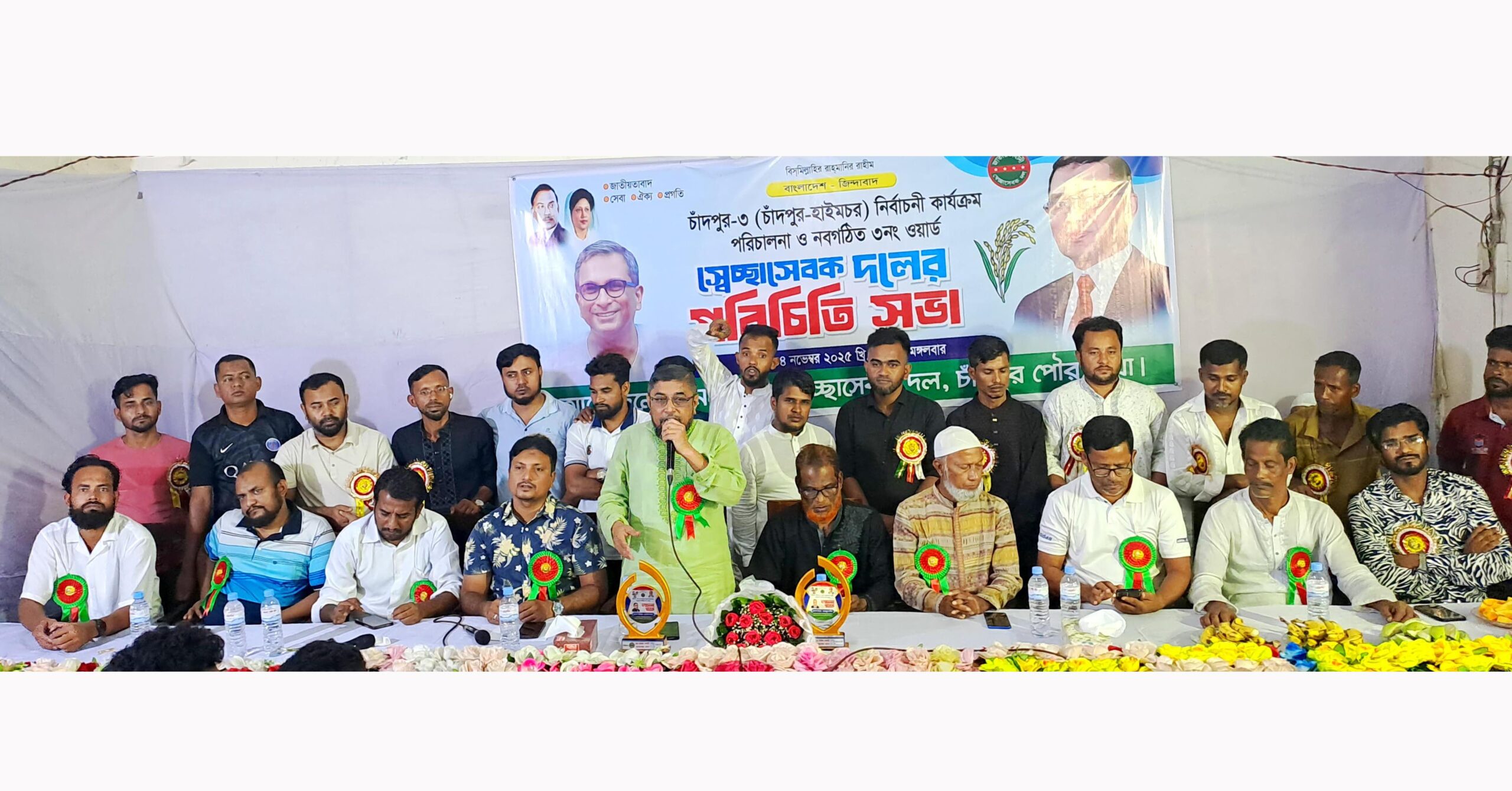 স্টাফ রিপোর্টার ঃ চাঁদপুর-৩ আসনে নির্বাচনী প্রচারণা কার্যক্রম এবং নবগঠিত পৌর ৩নং ওয়ার্ড স্বেচ্ছাসেবক দলের পরিচিতি সভা অনুষ্ঠিত হয়েছে। ৪ নভেম্বর মঙ্গলবার সন্ধ্যায় চাঁদপুর শহরের পুরান বাজার নূরিয়া উচ্চ বিদ্যালয়ে এই সভা অনুষ্ঠিত হয়। সভায় প্রধান অতিথির বক্তব্য রাখেন চাঁদপুর পৌর বিএনপির সভাপতি আক্তার হোসেন মাঝি। বিশেষ অতিথির বক্তব্য রাখেন পৌর বিএনপির সাধারণ সম্পাদক অ্যাডভোকেট হারুনুর রশীদ। প্রধান বক্তার বক্তব্য রাখেন চাঁদপুর জেলা স্বেচ্ছাসেবক দলের সিনিয়র যুগ্ম আহ্বায়ক শামছুল আলম সূর্য।