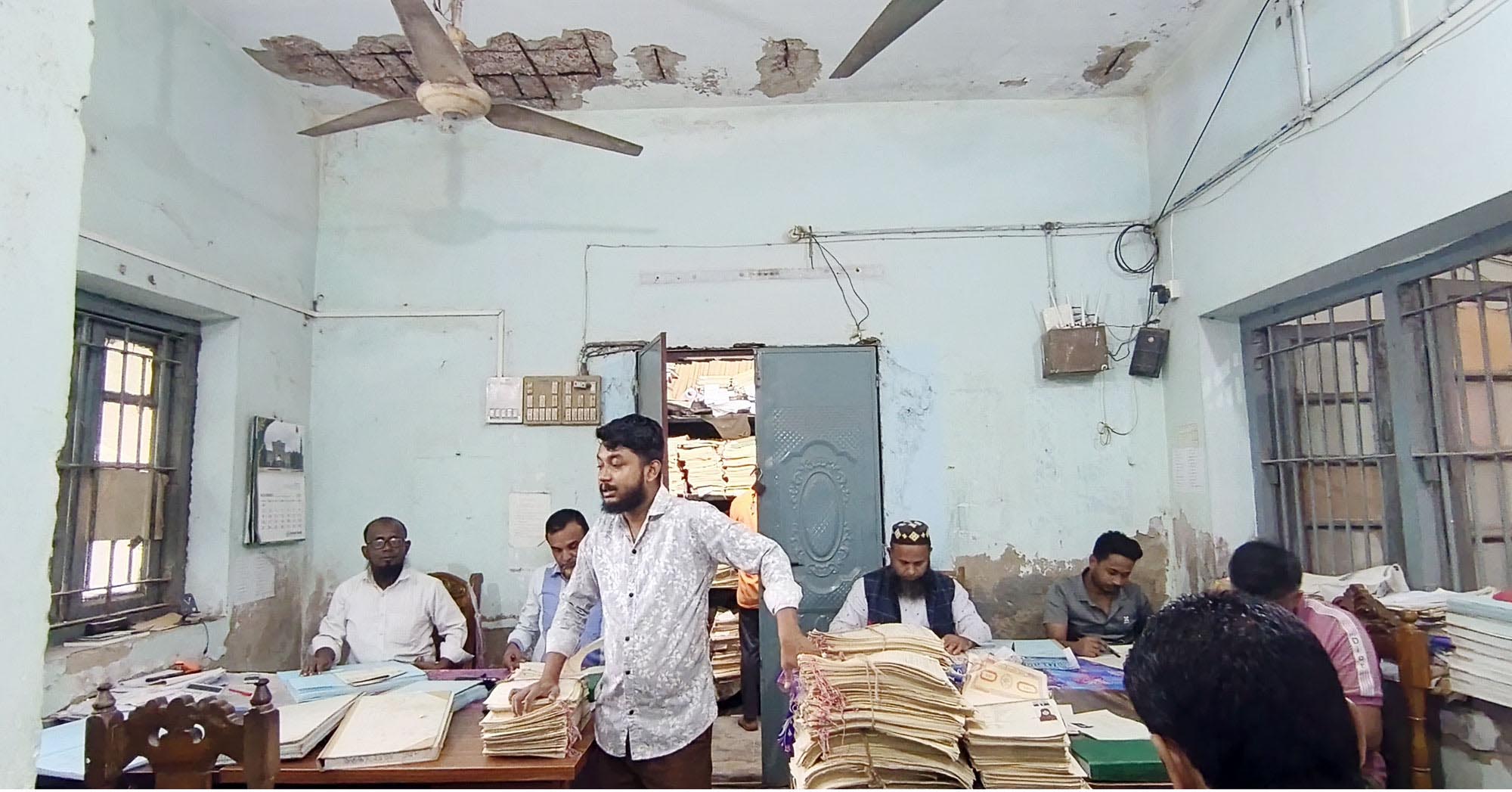 সরেজমিনে দেখা যায়, উপজেলার সাব-রেজিস্ট্রারের অফিস ভবনটি যে কোনো মুহূর্তে ধসে পড়ার আশঙ্কা করা হচ্ছে। ছাদের পলেস্তারা খসে ঢালাইয়ের রড বের হয়ে গেছে, দেয়ালে বড় বড় ফাটল। মরিচা ধরায় সিলিং ফ্যানের হুকগুলো নষ্ট হয়ে গেছে। মেঝের ঢালাই উঠে গেছে অনেক স্থানে।  বিদ্যুৎ লাইনও ঝুঁকিপূর্ণ। বৃষ্টি শুরু হলে টেবিলের ওপর পলিথিন দিয়ে রক্ষা করা হয় প্রয়োজনীয় দলিল-দস্তাবেজসহ প্রয়োজনীয় কাগজপত্র। এভাবেই ঝুঁকি নিয়ে কাজ করতে হচ্ছে কর্মকর্তা ও কর্মচারীদের।