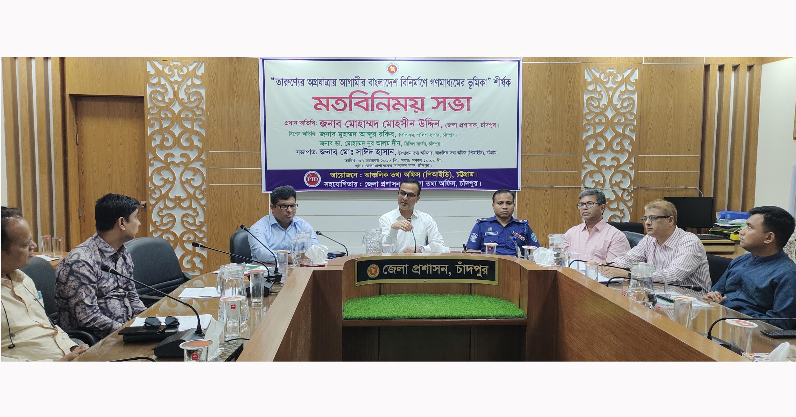 স্টাফ রিপোর্টার ঃ ‘তারুণ্যের অগ্রযাত্রায় আগামীর বাংলাদেশ বিনির্মাণে গণমাধ্যমের ভূমিকা’ শীর্ষক এক মতবিনিময় সভায় মঙ্গলবার (৭ অক্টোবর) চাঁদপুর জেলা প্রশাসকের সম্মেলন কক্ষে অনুষ্ঠিত হয়েছে। সভার আয়োজন করে চট্টগ্রাম প্রেস ইনফরমেশন ডিপার্টমেন্ট (পিআইডি)।