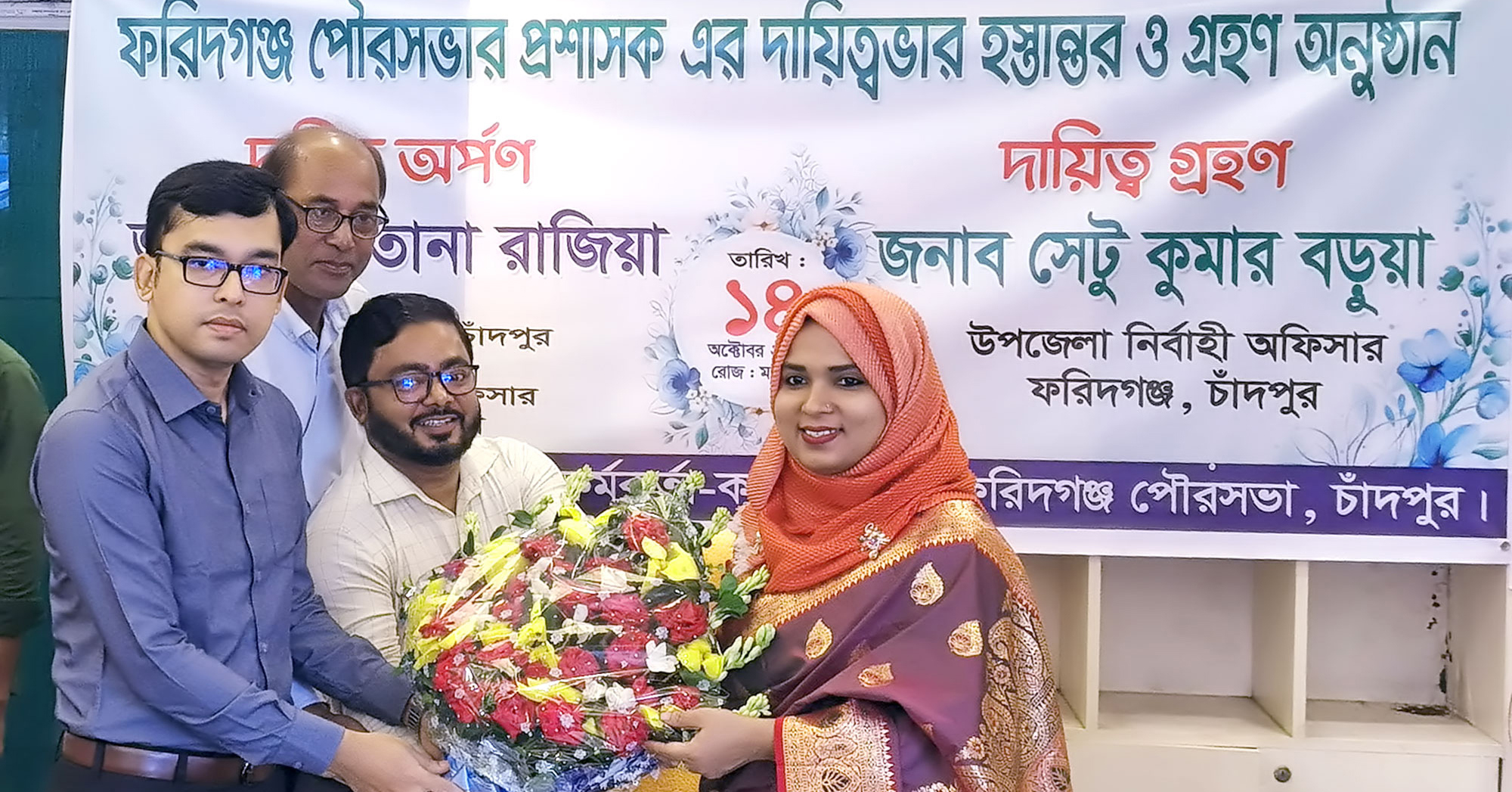 মঙ্গলবার (১৪ অক্টোবর ২০২৫) দুপুরে পৌর নির্বাহী কর্মকর্তা শাহ সুফিয়ান খাঁনের সঞ্চালনায় বক্তব্য রাখেন বিদায়ী পৌর প্রশাসক ও ইউএনও সুলতানা রাজিয়া, নবাগত পৌর প্রশাসক ও ইউএনও সেটু কুমার বড়ুয়া, ফরিদগঞ্জ প্রেসক্লাবের সভাপতি মামুনুর রশিদ পাঠান, পৌরসভার নির্বাহী প্রকৌশলী আব্দুল কাদির।