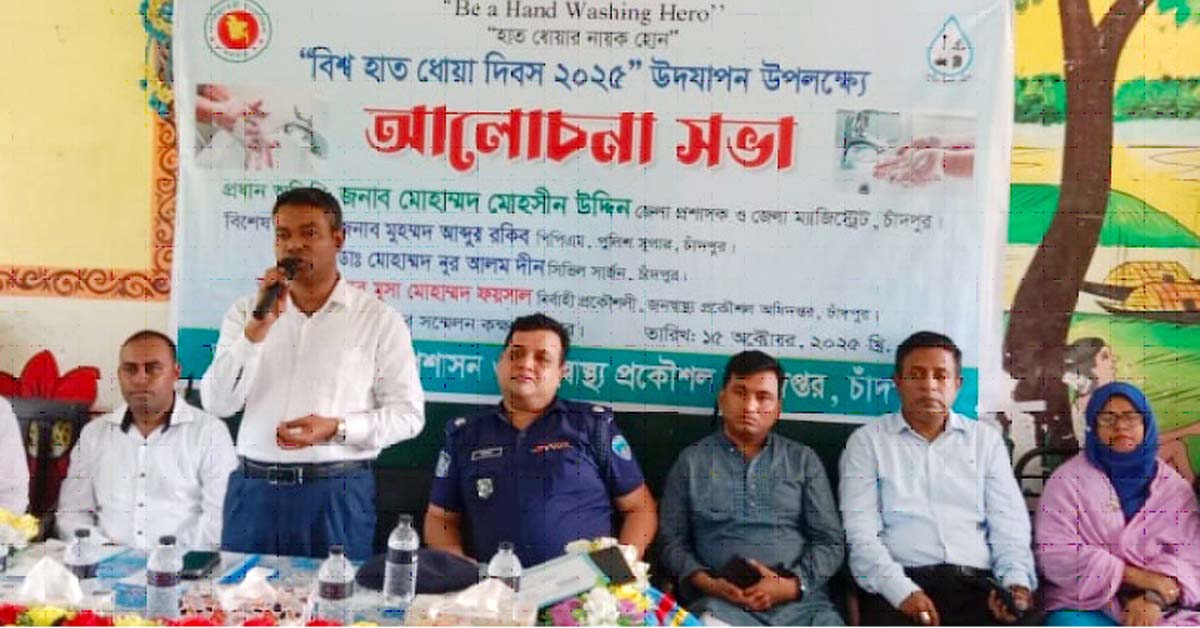 অনুষ্ঠানে প্রধান অতিথির বক্তব্য রাখেন চাঁদপুরের অতিরিক্ত জেলা প্রশাসক (সার্বিক) মো. এরশাদ উদ্দিন। তিনি বলেন, স্বাস্থ্য সুরক্ষায় হাত ধোয়া সবচেয়ে সহজ ও কার্যকর উপায়। নিয়মিত হাত ধোয়ার অভ্যাস গড়ে তুললে সংক্রামক রোগ প্রতিরোধ করা সম্ভব। আমরা প্রায়ই দেখি— অজান্তেই হাতের মাধ্যমে জীবাণু শরীরে প্রবেশ করে নানা রোগ সৃষ্টি করে। তাই প্রতিদিনের কাজের আগে ও পরে, বিশেষ করে খাবার খাওয়ার পূর্বে এবং টয়লেট ব্যবহারের পর সাবান ও পরিষ্কার পানি দিয়ে অন্তত ২০ সেকেন্ড ধরে হাত ধোয়া উচিত।