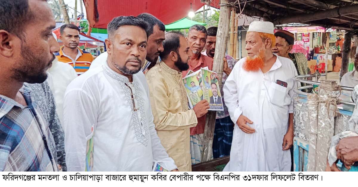 গাজী মমিন,ফরিদগঞ্জ : চাঁদপুর-৪ (ফরিদগঞ্জ) আসনে বিএনপির মনোনয়ন প্রত্যাশী ও জাতীয়তাবাদী সাংস্কৃতিক দলের কেন্দ্রীয় কমিটির সভাপতি হুমায়ুন কবির বেপারীর পক্ষে ৩১ দফা দাবি সংবলিত লিফলেট বিতরণ কর্মসূচি অব্যাহত রয়েছে।